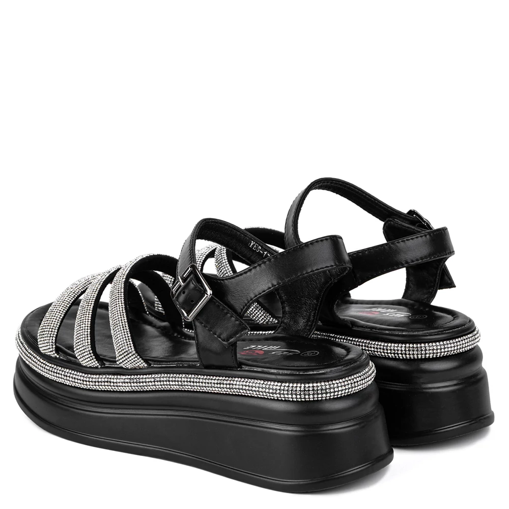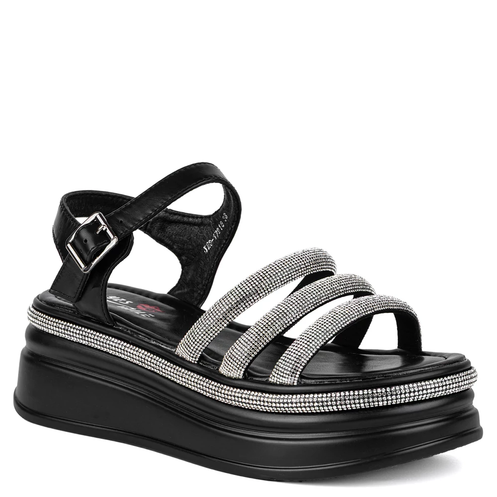 Látványos megjelenésű platform szandál, fényes kövekkel díszített pántokkal. A többrétegű talpkialakítás határozott vonalat kölcsönöz a modellnek, míg a bokapánt csatos rögzítése biztos tartást ad.
