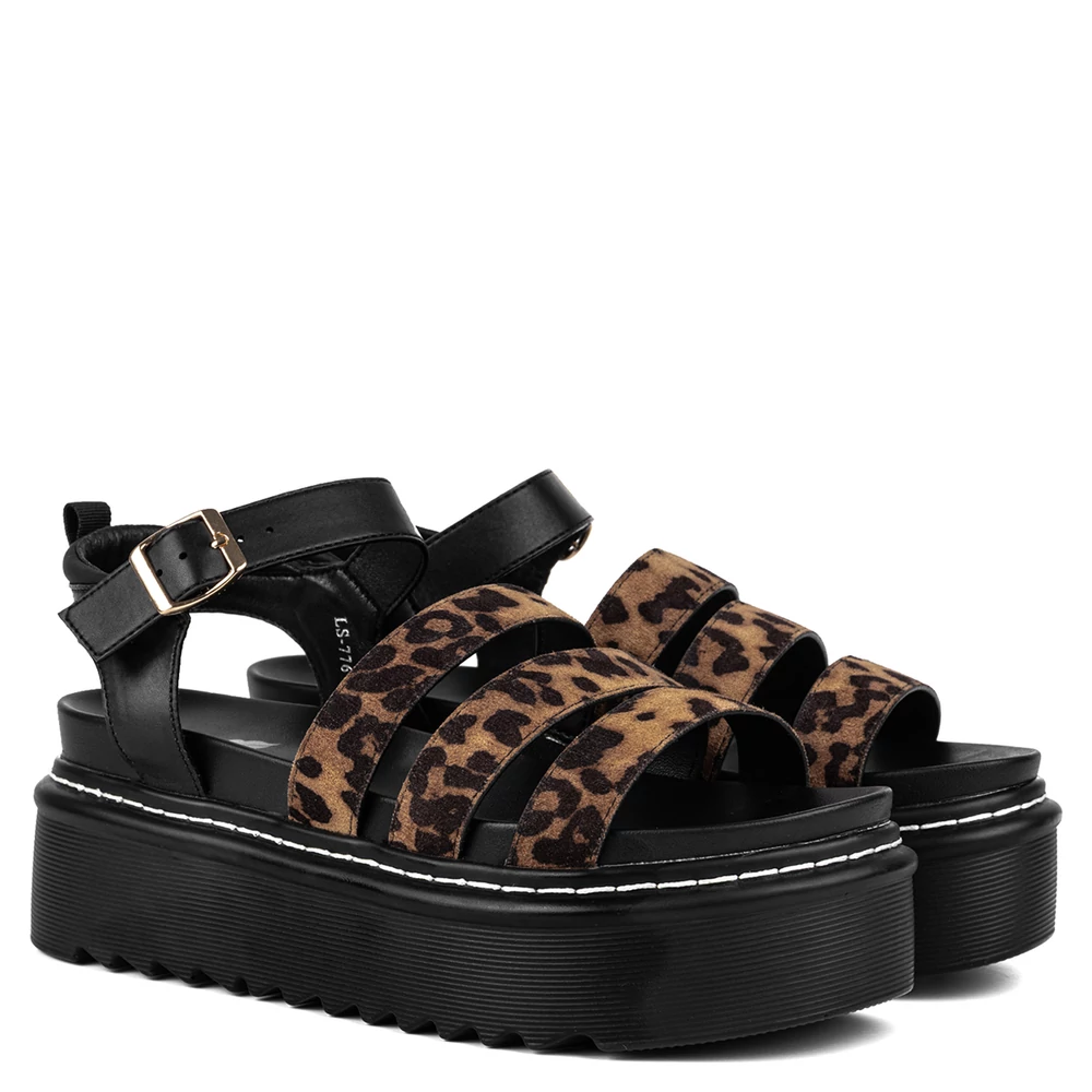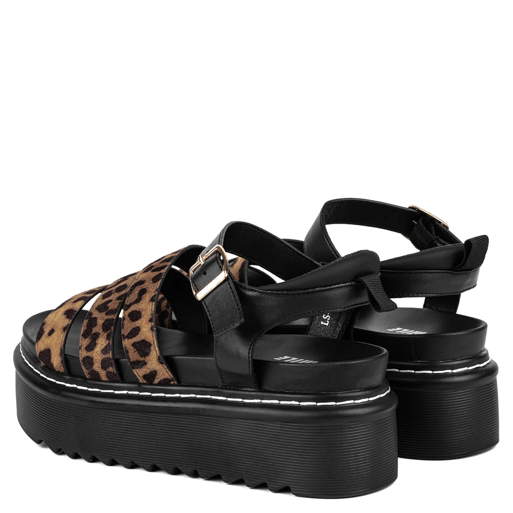Platform szandál karakteres, modern kialakítással. A többsoros pántmegoldás biztos tartást nyújt, a csatos zárás pedig állíthatóságot tesz lehetővé.
