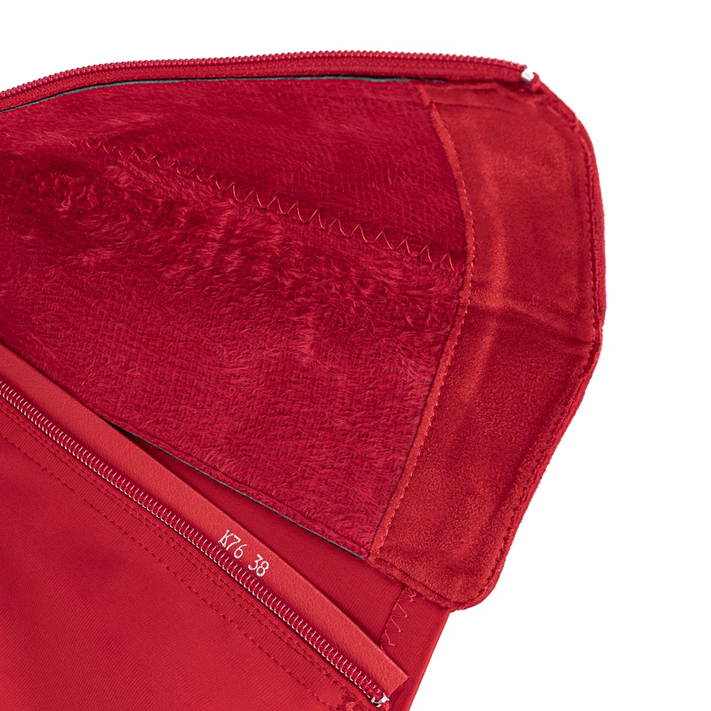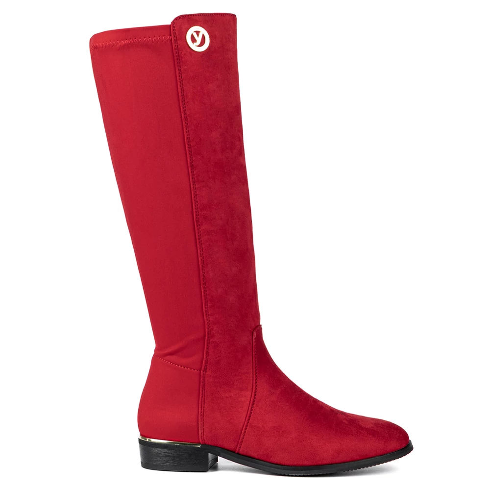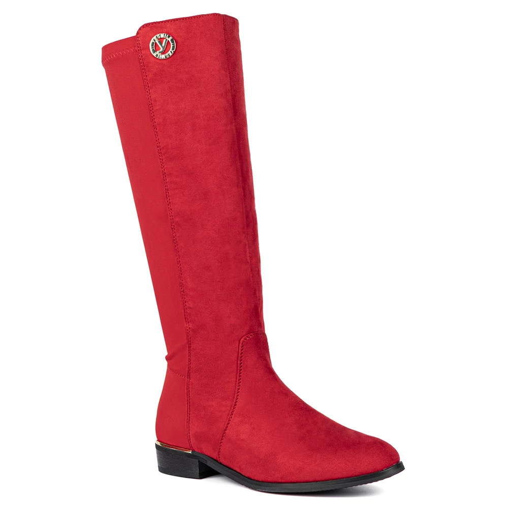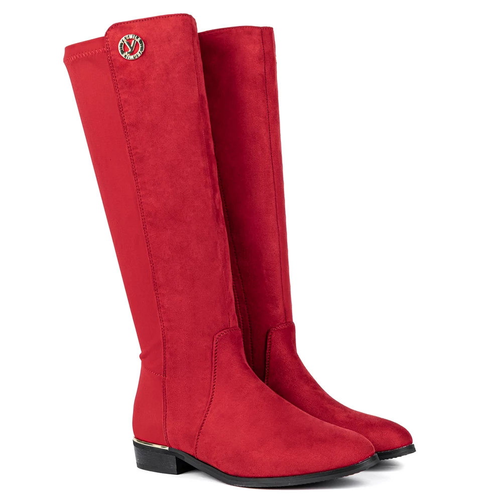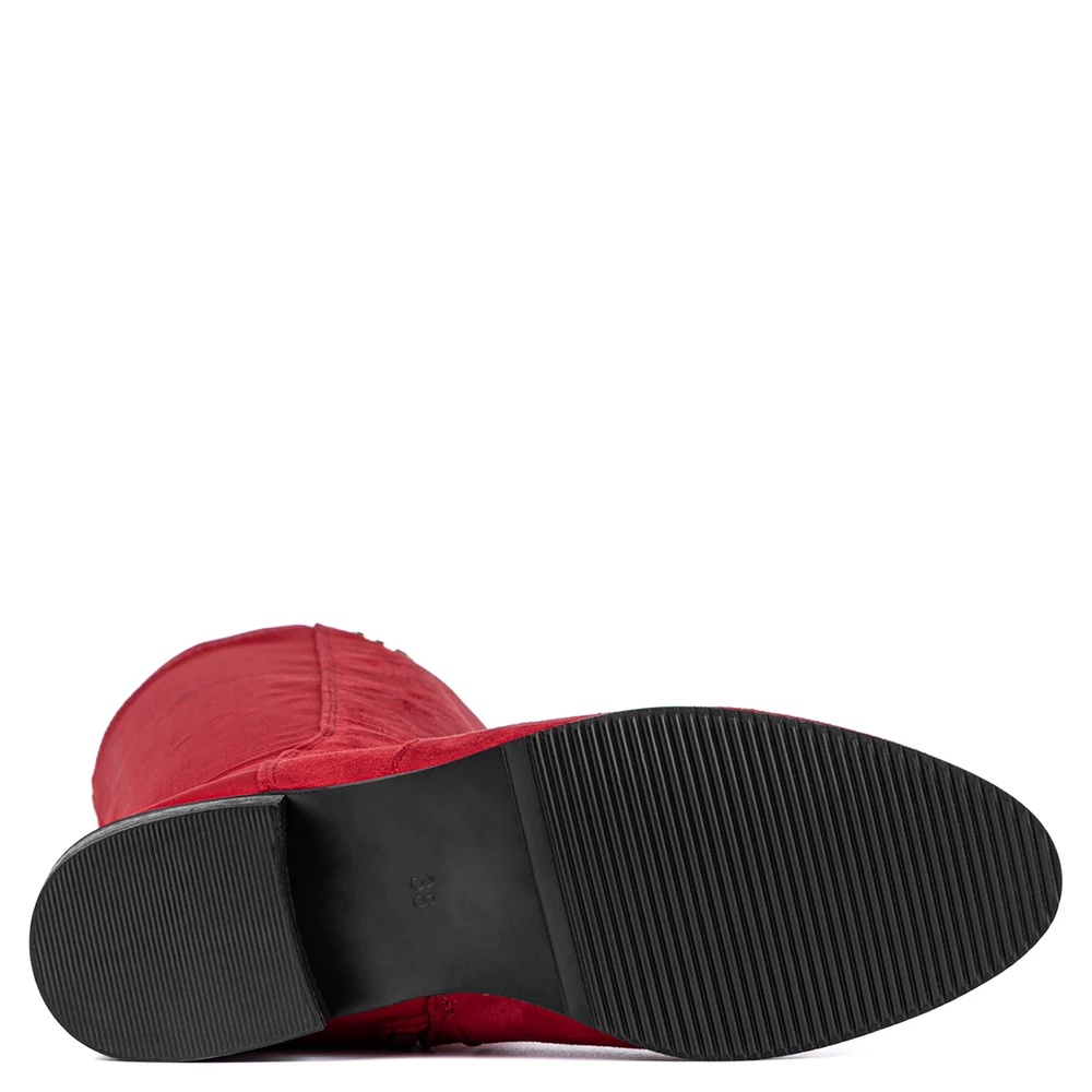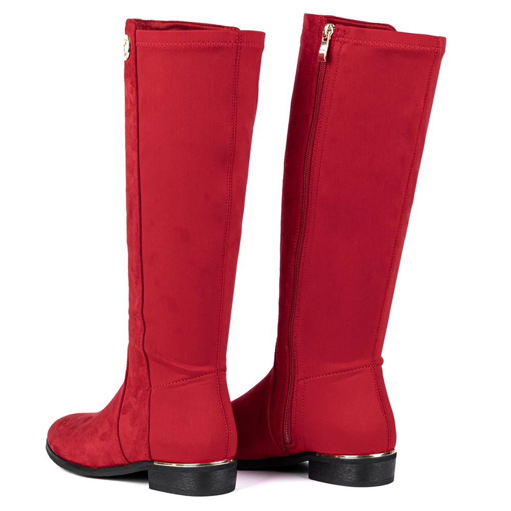Yesmile Piros Színű Művelúr Női Magasszárú Csizma Arany Kiegészítőkkel